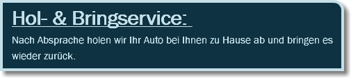Für den Fall, dass Sie keinen Ersatzwagen benötigen, die Reparatur aber doch etwas länger dauert und Sie nicht die ganze Zeit warten wollen, bringt Sie einer unserer Mitarbeiter gerne in einem unserer KFZ nach Hause. Wenn Ihr Fahrzeug dann fertig ist informieren wir Sie sofort telefonisch und holen Sie dann natürlich auch gerne wieder ab.
